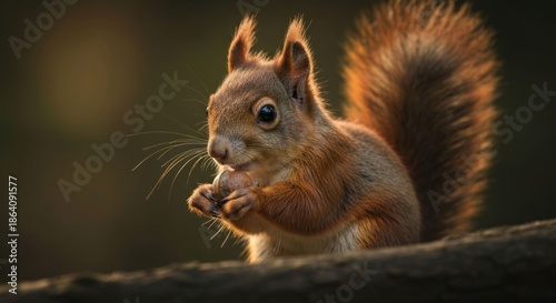 © RONNY, Fototapeta premium Squirrel portrait bright, furry, gripping a nut