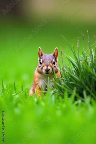 © anu, Naklejka premium Squirrel s bushy tail playfully peeking from behind a clump of grass. A vibrant, shallow depth of field photograph focusing on the fluffy, bushy tail of a squirrel peeking out from behind a lush clump