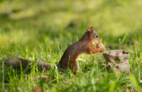 © nelik, Fototapeta premium Squirrel sitting near a bag with nuts