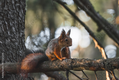 Fototapeta premium Squirrel sitting on a branch in the forest. Eurasian red squirrel