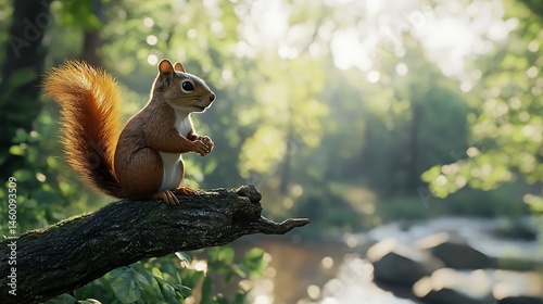 © Nayon, Obraz premium Squirrel Sitting on Tree Branch in Golden Autumn Forest Lighting high resolution picture