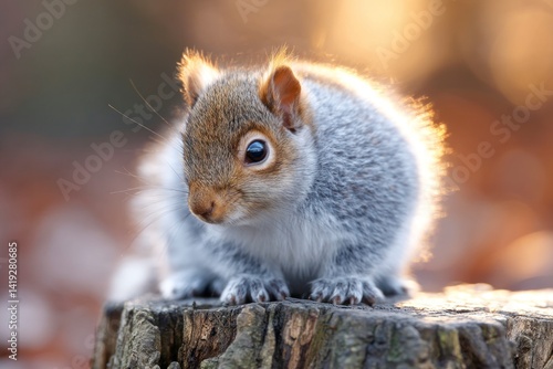© El Media, Fototapeta premium Squirrel Sitting on Tree Stump in Forest with Golden Sunlight