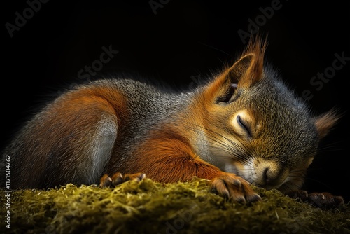 Obraz premium Squirrel sleeping on the moss isolated on black background, studio shot