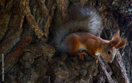 Fototapeta premium Squirrel with a fluffy tail sitting on a tree in the shade. tree squirrel