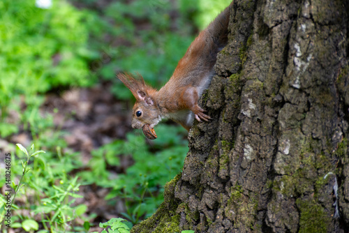 © Andrey, Naklejka premium squirrel with a nut in its teeth climbs a tree