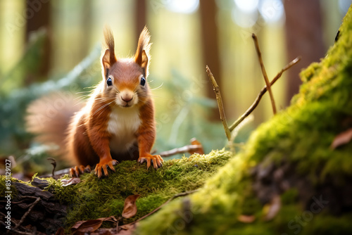 © Creative Laik, Naklejka premium Squirrel with open mouth on a log in the autumn forest.