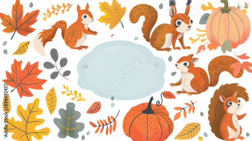 Fototapeta premium Squirrels and Autumn Leaves with Pumpkin Illustration