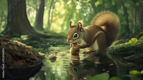 © El Media, Obraz premium Squirrels drink natural water in the forest. Squirrel in the wild.