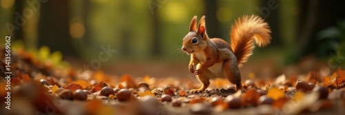 © Kachaphot, Fototapeta premium Squirrels jumping through a pile of acorns on the ground, squirrel, nature, autumn