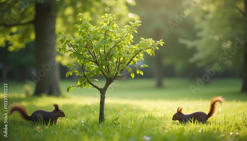 © PTD, Fototapeta premium Squirrels playfully explore lush green park, surrounded by vibrant foliage and small tree. warm sunlight creates serene atmosphere, highlighting beauty of nature
