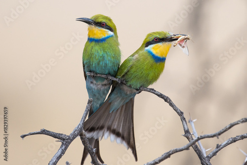 © Peter, Obraz premium Sqwallow-tailed bee-eater in the Kgalagadi, South Africa. The insect is used as partof the courtship display.
