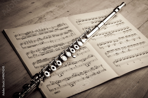 © Tommaso Lizzul, Naklejka premium Srebrny flet na tle starożytnej partytury muzycznej