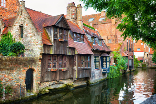 © Jose Ignacio Soto, Fototapeta premium Średniowieczne domy nad kanałem z białymi kaczkami w Brugii, Belgia