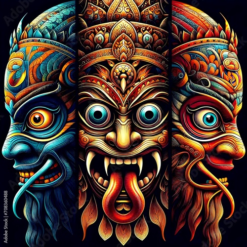Naklejka premium Sri Lanka Traditional Mask Art - Cultural Masks in Vivid Colors: A Journey into Sri Lanka Traditional Art Style.