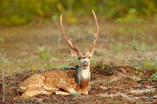 © ondrejprosicky, Naklejka premium Sri Lankan axis deer Axis ceylonensis, or Ceylon spotted deer, nature habitat. Bellow majestic powerful adult animal sitting in grass. Deer hidden in grass, big animal, Asia. Sri Lanka wildlife.