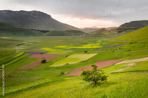 © Roberto, Fototapeta premium Środkowa włoska wieś, z doliną porośniętą kolorowymi polami soczewicy i samotnym drzewem na pierwszym planie
