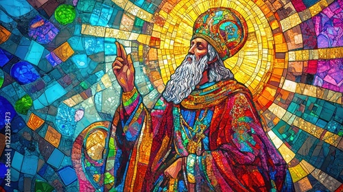 © savittree, Fototapeta premium St. Ambrose depicted in colorful stained glass, surrounded by intricate designs and radiant hues