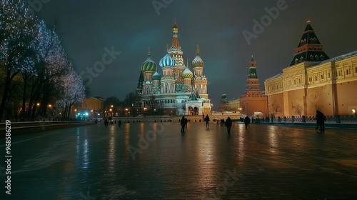 © Yusif, Obraz premium St. Basil's Cathedral in Moscow, Russia, illuminated at night on Red Square.