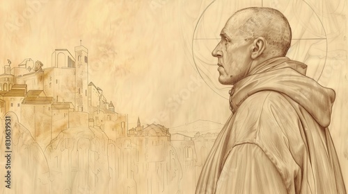 © T Studio, Fototapeta premium St. Bruno of Cologne in Reflection in 11th-Century French Monastery, Biblical Illustration, Beige Background, Copyspace