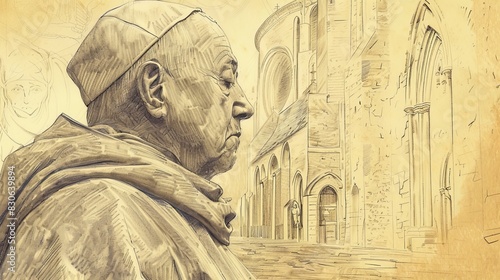 © T Studio, Fototapeta premium St. Bruno of Cologne in Reflection in 11th-Century French Monastery, Biblical Illustration, Beige Background, Copyspace