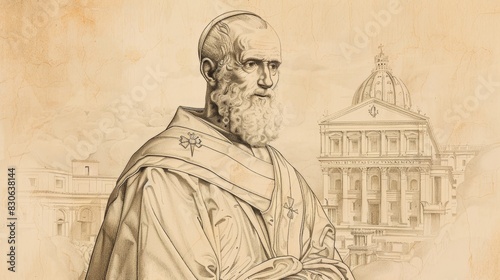Fototapeta premium St. Damasus I in Papal Robes in 4th-Century Roman Basilica, Biblical Illustration, Beige Background, Copyspace