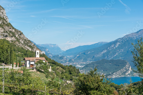 © dmaphoto, Fototapeta premium St. Georgio Kirche in der Berglandschaft von Pregasina, im Hintergrund der Gardasee und der Berg Brione bei Riva
