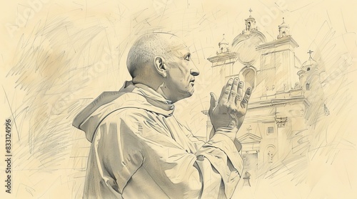 Fototapeta premium St. Ignatius of Loyola in Prayer, Vision of Christ, Biblical Illustration, Beige Background, Copyspace
