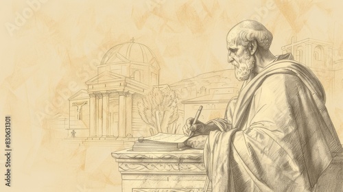 Fototapeta premium St. Irenaeus Writing in 2nd-Century Church, Biblical Illustration, Beige Background, Copyspace