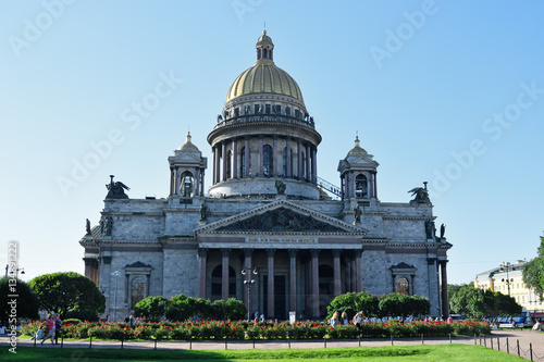 © herculerus, Fototapeta premium St. Isaac's Cathedral and red roses on the square bright Sunny d