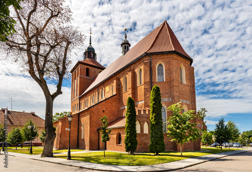 © Art Media Factory, Fototapeta premium St. John Evangelist church Kosciol Sw. Jana Ewangelisty aside Plac Konstutucji square in historic old town center of Bartoszyce in Poland