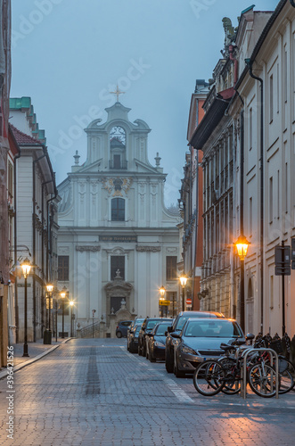 Fototapeta premium St John street in the night and piarist church, Krakow, Poland, old city