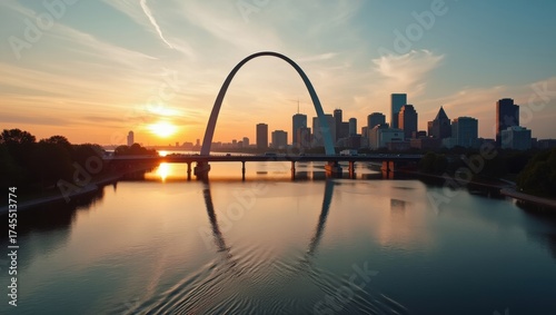Obraz premium St. Louis Gateway Arch and Cityscape Reflected in the Calm River at Sunrise