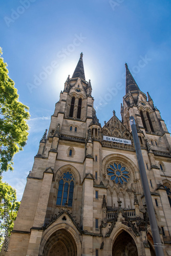 Fototapeta premium St. Maria Church in Stuttgart with sun illuminated behind the tower