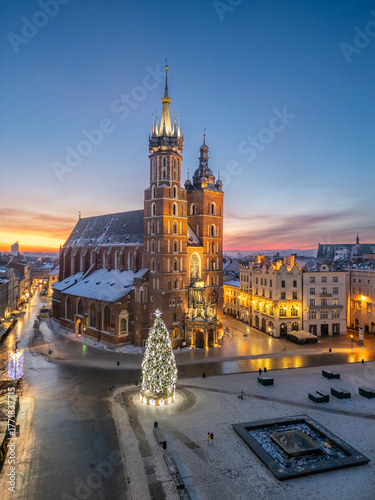 Obraz premium St Mary's church and Christmas tree on the snow covered Main Square in the winter dawn, Krakow, Poland