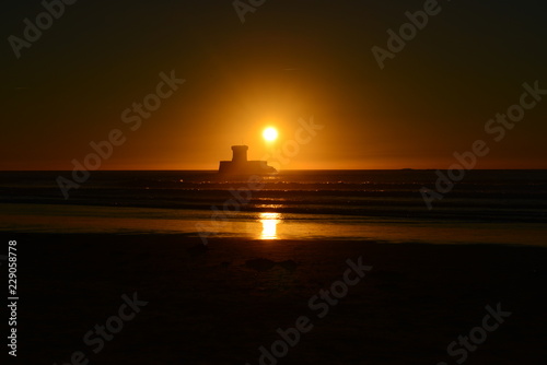 Naklejka premium St Ouen Bay, Jersey, U.K. Local 19th century landmark at sunset in Autumn.