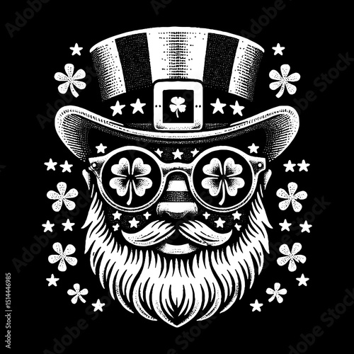 © MIFTAH, Obraz premium St Patrick Face With Clover Glasses And Green Stars Illustration – Retro Hand-Drawn Festive Portrait Vector Artwork for T-Shirts, Posters, Stickers, and St. Patrick’s Day-Themed Apparel Designs