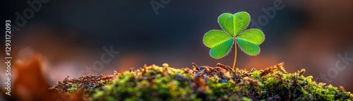 Fototapeta premium St.Patrick’s Day Celebration Concept, A close-up of a single green clover leaf sprouting from mossy ground with a blurred background.