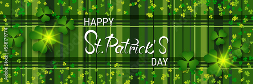 © Ulvur, Fototapeta premium St.Patrick's Day vector banner template. Green plaid background with colorful clover leaves