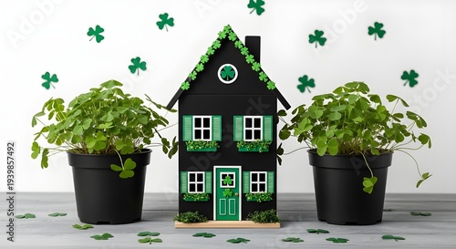 © Md Nurullah , Naklejka premium St patricks day decorations with green house and shamrock plants