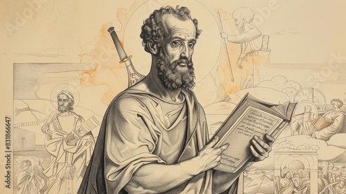 Fototapeta premium St. Paul with Book and Sword, Missionary Journeys, Biblical Illustration,...