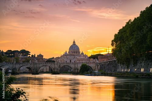 © Pawel Pajor, Fototapeta premium St. Peter's basilica across Tiber River canal at sunset in Rome, Italy