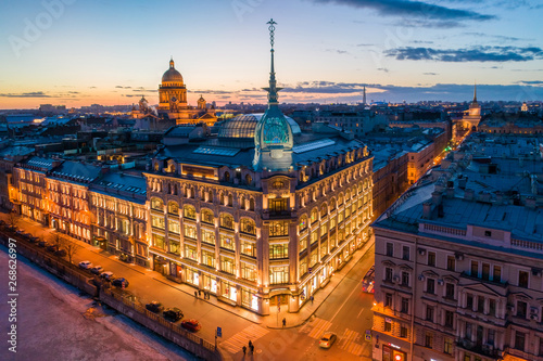 © Stanislav Samoylik, Naklejka premium ST. PETERSBURG, RUSSIA - MARCH, 2019: Department store shop class luxury, near the Red Bridge. In the background the city and St. Isaac's Cathedral, in the evening at sunset