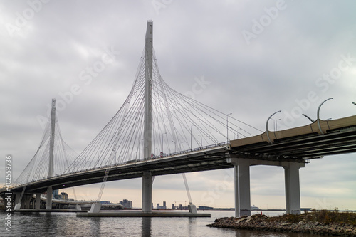 Naklejka premium St. Petersburg. Russia, October 20, 2019. The cable-stayed bridge across the Petrovsky fairway of the western high-speed diameter.