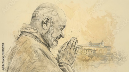 © T Studio, Fototapeta premium St. Pio of Pietrelcina in Prayer in 20th-Century Italian Monastery, Biblical Illustration, Beige Background, Copyspace