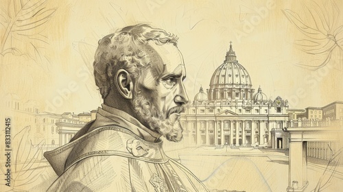 Fototapeta premium St. Robert Bellarmine in Scholarly Setting, Vatican, Biblical Illustration, Beige Background, Copyspace
