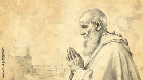 © T Studio, Fototapeta premium St. Simon the Apostle in Prayer in 1st-Century Church, Biblical Illustration, Beige Background, Copyspace