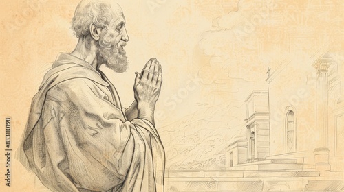 Fototapeta premium St. Simon the Apostle Praying in 1st-Century Church, Biblical Illustration, Beige Background, Copyspace