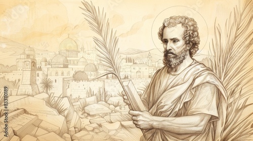 © T Studio, Fototapeta premium St. Stephen Holding Palm Branch and Stones in Ancient Jerusalem, Biblical Illustration, Beige Background, Copyspace