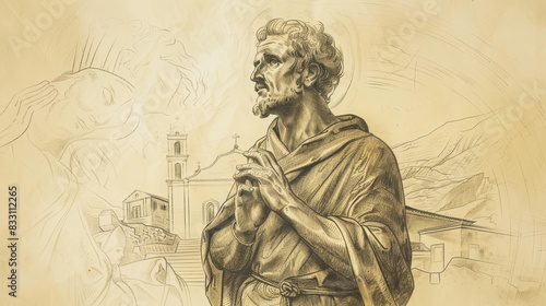 © T Studio, Fototapeta premium St. Stephen the Martyr in Martyrdom, 1st-Century Church, Biblical Illustration, Beige Background, Copyspace