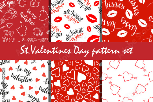 Fototapeta premium St.Valentines Day lettering, hearts and lips seamless pattern set of 6, red and white backgrounds vector for cards, banners, wrapping paper, posters, scrapbooking, pillow, cups and fabric design.